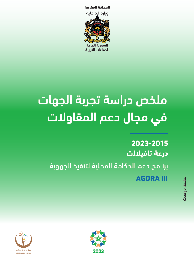 دراسة حول تجربة جهة درعة- تافيلالت في مجال دعم المقاولات (2015–2023)هذا الإصدار حلقة من سلسلة دراسات حول تجربة الجهات في مجال دعم المقاولات (2015–2023). وهو عبارة عن ملخص دراسة حول تجربة جهة درعة- تافيلالت في هذا المجال، حيث تقدم هذه الدراسة تقييما عاما للمبادرات المتخذة من طرف الجهة في مجال المواكبة الاقتصادية، قصد تعزيز الانسجام والأثر وتثمين المكتسبات. |